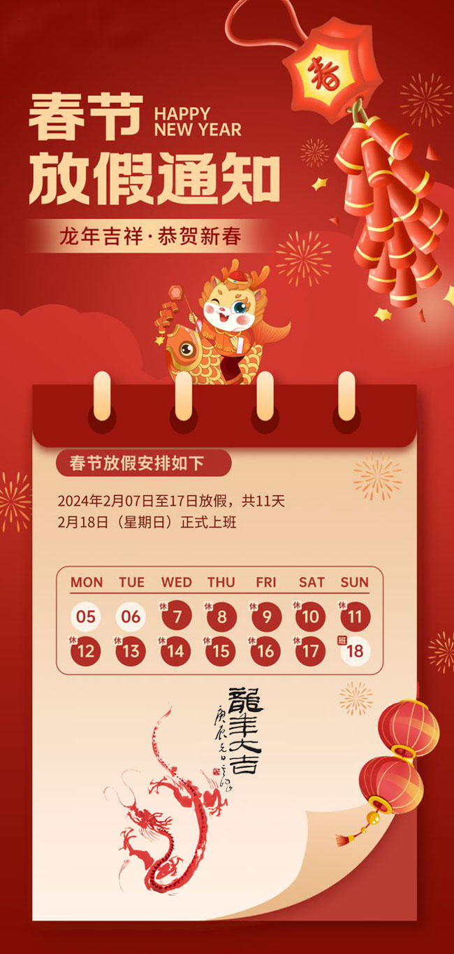 具體放假時間為:2024年2月7日-2月17日放假,共11天,2月18日(星期天)正式上班。放假期間網(wǎng)站問題電話或微信反饋,我們第一時間處理,電話:15399213588(同微信)